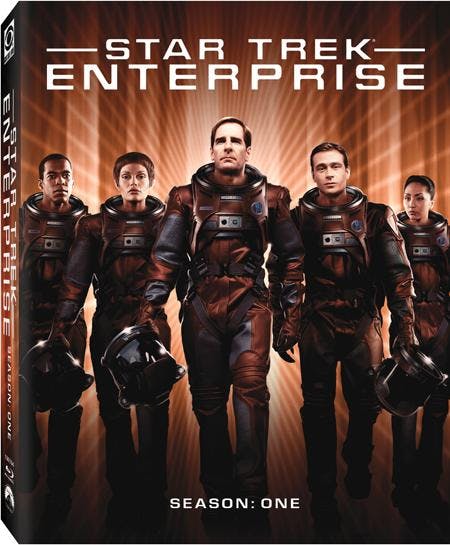 Star Trek: Enterprise will make its Blu-ray debut on March 26 with Star Trek: Enterprise -- The Complete First Season, with a cover conceived utilizing fan input. The six-disc set, from CBS Home Entertainment and Paramount Home Media Distribution, will include all 25 first-season Enterprise episodes and several new audio commentaries (featuring Rick Berman, Brannon Braga, Dan Curry, Mike Sussman, David Livingston, Connor Trinneer, Dominic Keating, and more). Also included are several new bonus features, notably "To Boldly Go: Launching Enterprise," a three-part retrospective documentary.