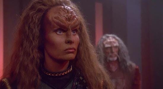 Grilka is definitely at the top, first of all, because she's full Klingon. I love K'Ehleyr and I love B'Elanna, but they're both half-Klingon. B'Elanna, like we see with anyone who's half and half, is they have that internal struggle. I love watching that, but certainly for me, since L'Rell is full Klingon, seeing Grilka, I love her story of eventually becoming the leader of her own house. Klingons are so patriarchal, so that was a great way to explore that story, in both episodes that she's in. Her relationship with Quark was so fun and wonderful, and she just owned herself in this great way. There's something about that I've tried to transfer to L'Rell, and it’s that her strength and power don't negate her sensuality. Grilka is the one that really always comes to mind.