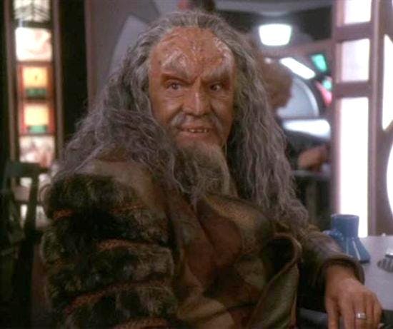While “Trials and Tribble-ations” may appear on the surface to be the bigger, wetter kiss to longtime Trek fans, “Blood Oath’s” pure play to true enthusiasts of continuity was a game changer. Three characters who were never remotely household names all came back, giving firm and strangely specific ties between the “old” Trek and the new.It was 19 years ago this week that the episode first aired. It begins with Quark and Odo pulling a drunken Klingon out of a holosuite. In short order we learn that it is Kor (John Colicos) – yes, Kor, the Klingon who played Cold War games with Kirk on Organia in “Errand of Mercy.” If that isn't enough to make our heads spin, he is soon visited in the Brig by Koloth (William Campbell), yes, Koloth, the sneaky Klingon who crossed Kirk, quadrotriticale and the Tribbles on Deep Space Station K-7 in “The Trouble With Tribbles.” Later, it is discovered that they were assembled by Kang, the Klingon who had to put aside his hate (temporarily) with Kirk in “Day of the Dove.”